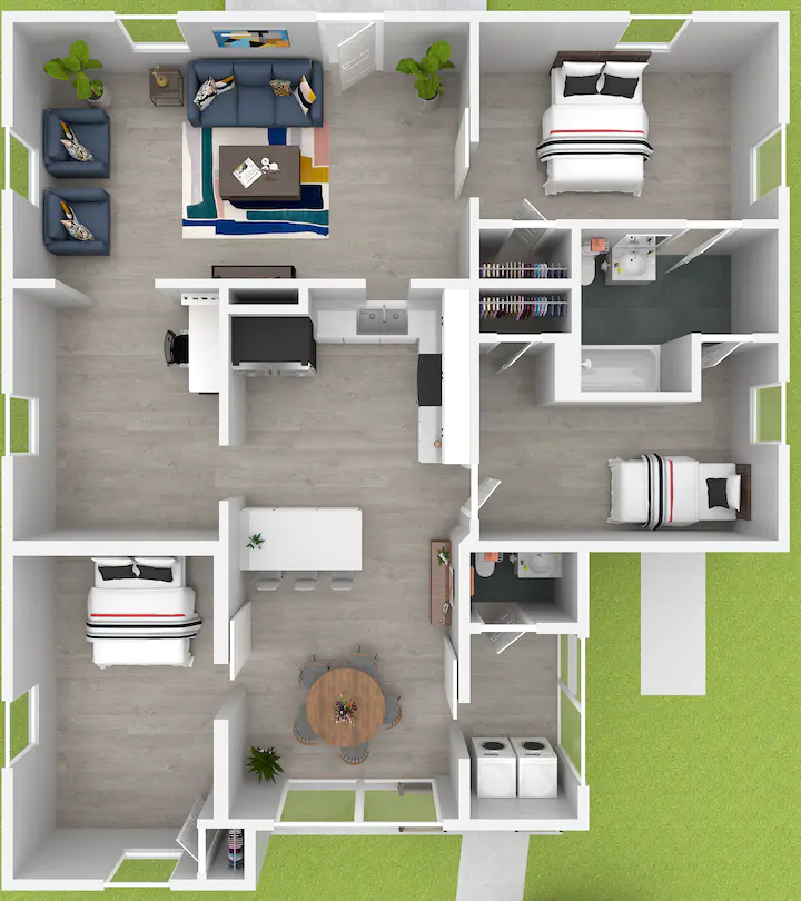 3rd bedroom furnished with a queen bed and 60″ smart-tv. 3rd bathroom with walk-in shower, laundry room with drop-down work table.